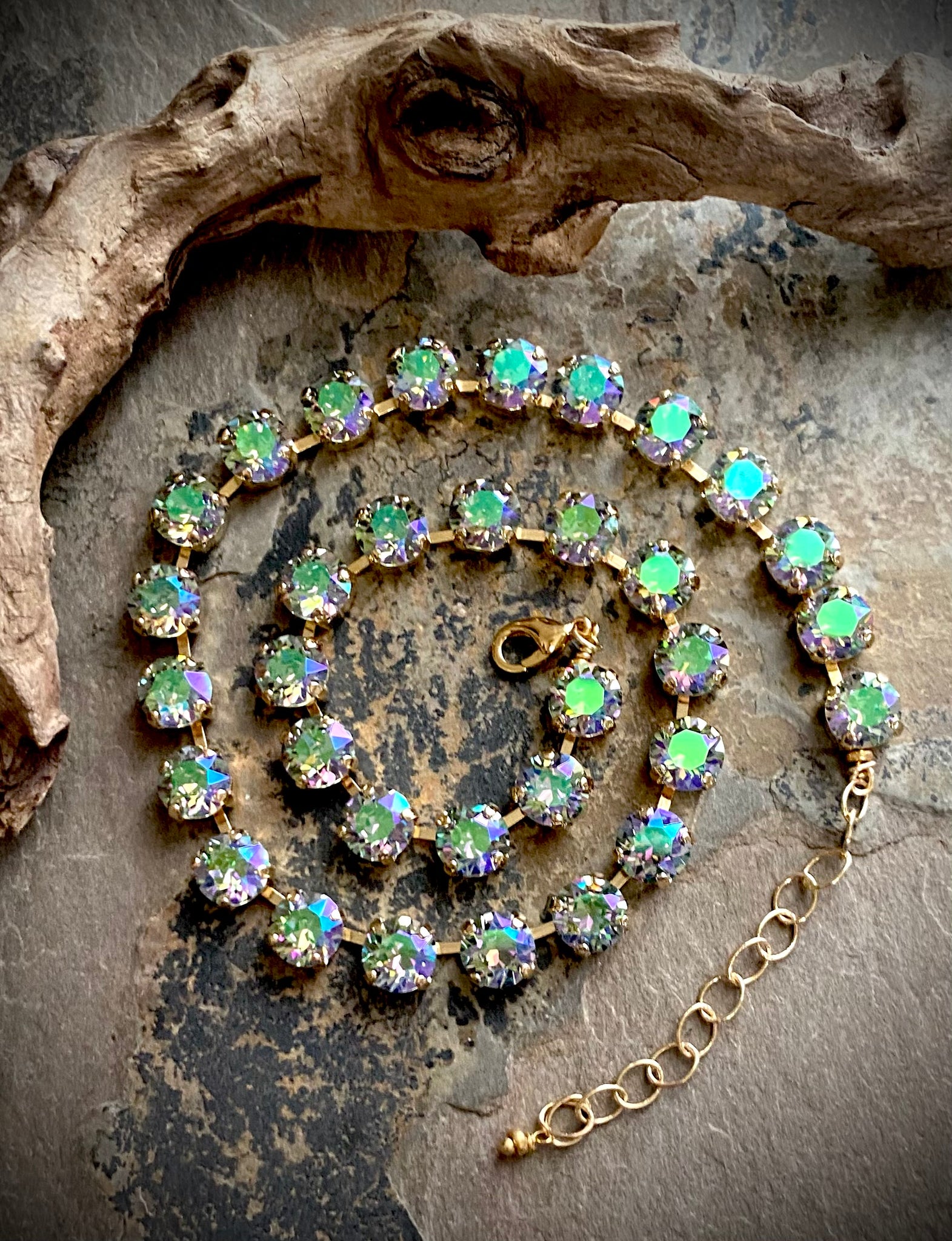 What better way to dress up a denim shirt than a full strand of genuine Austrian crystals in your choice of color and length- select your choices from the drop down box here. Each necklace is created by hand, and comes with a 2 inch extension piece.