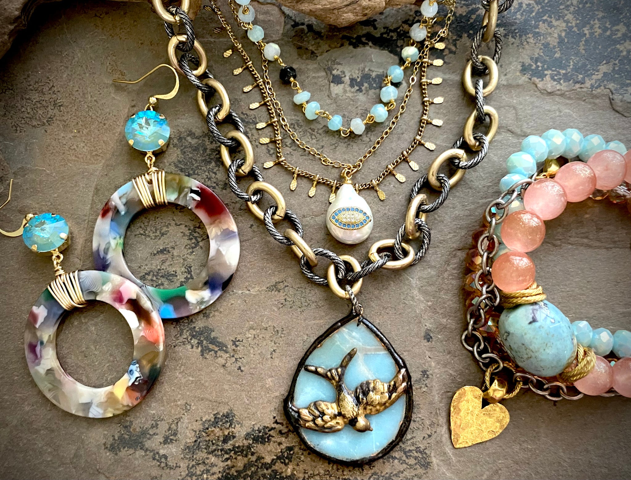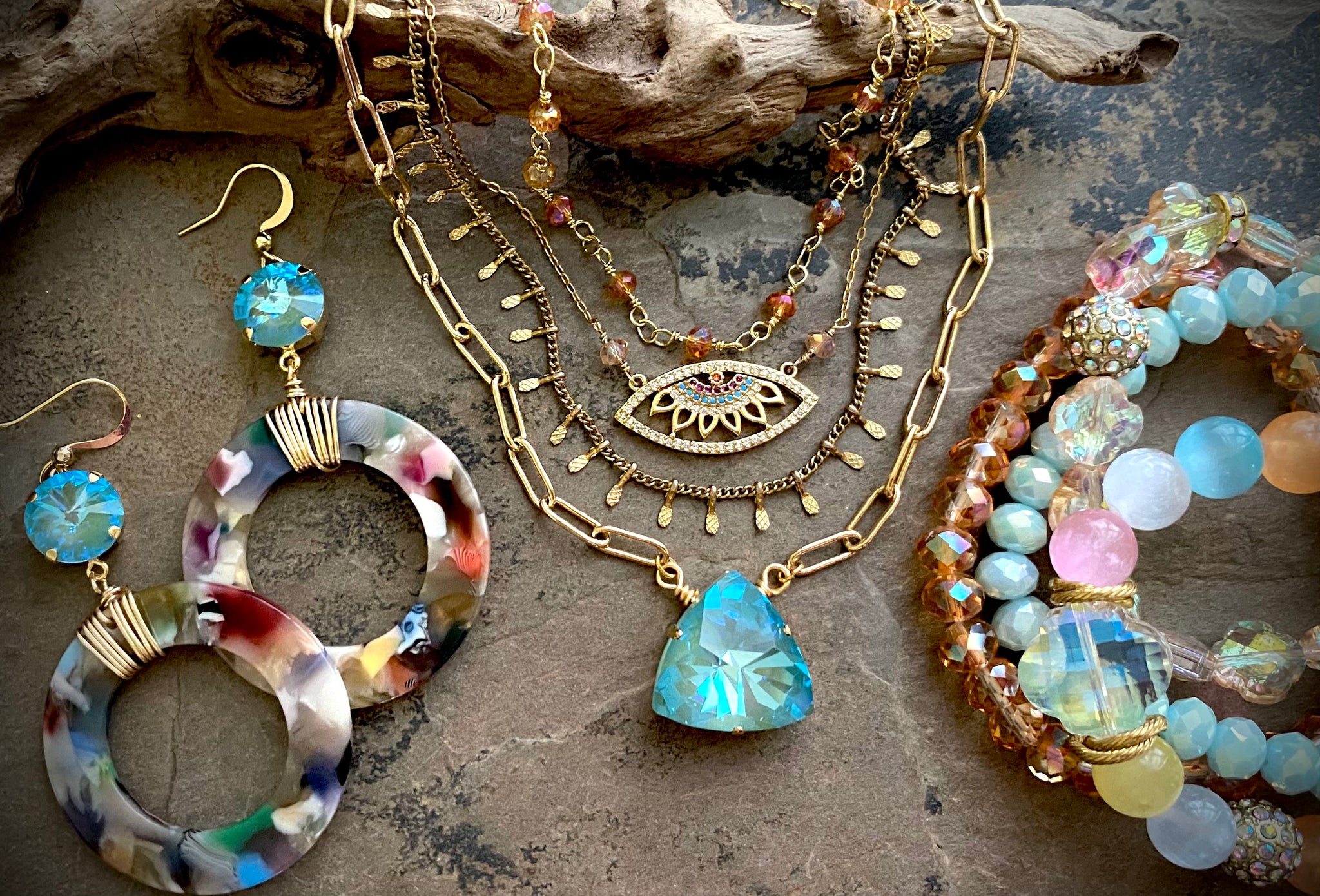 One of my most popular styles is back! Wire wrapped acrylic hoops with a pop of crystal color! These are super lightweight and measure around 2.5 inches