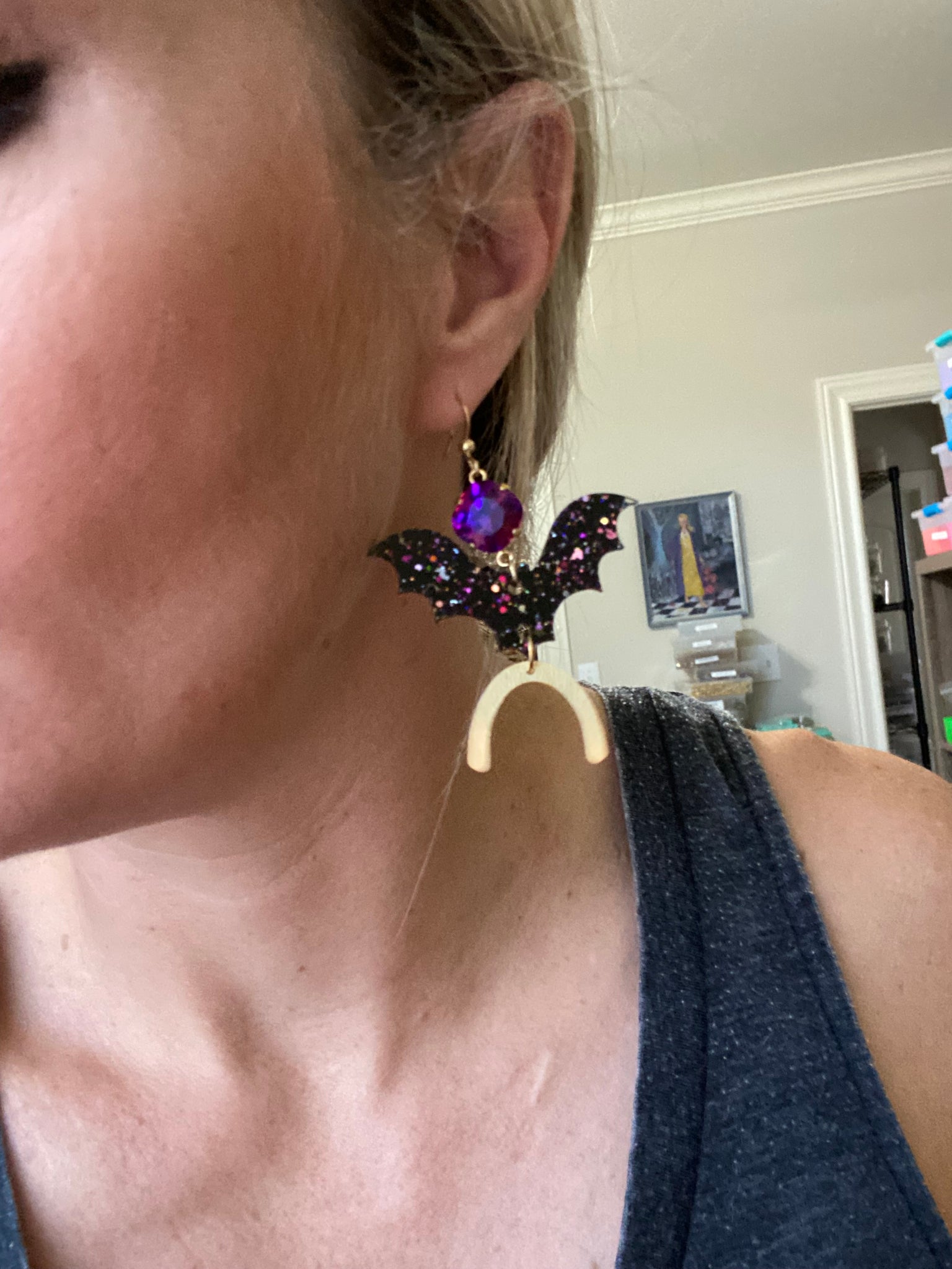 12mm round crystal with bat connector, crescent accent, and wire wrapped AB drop.