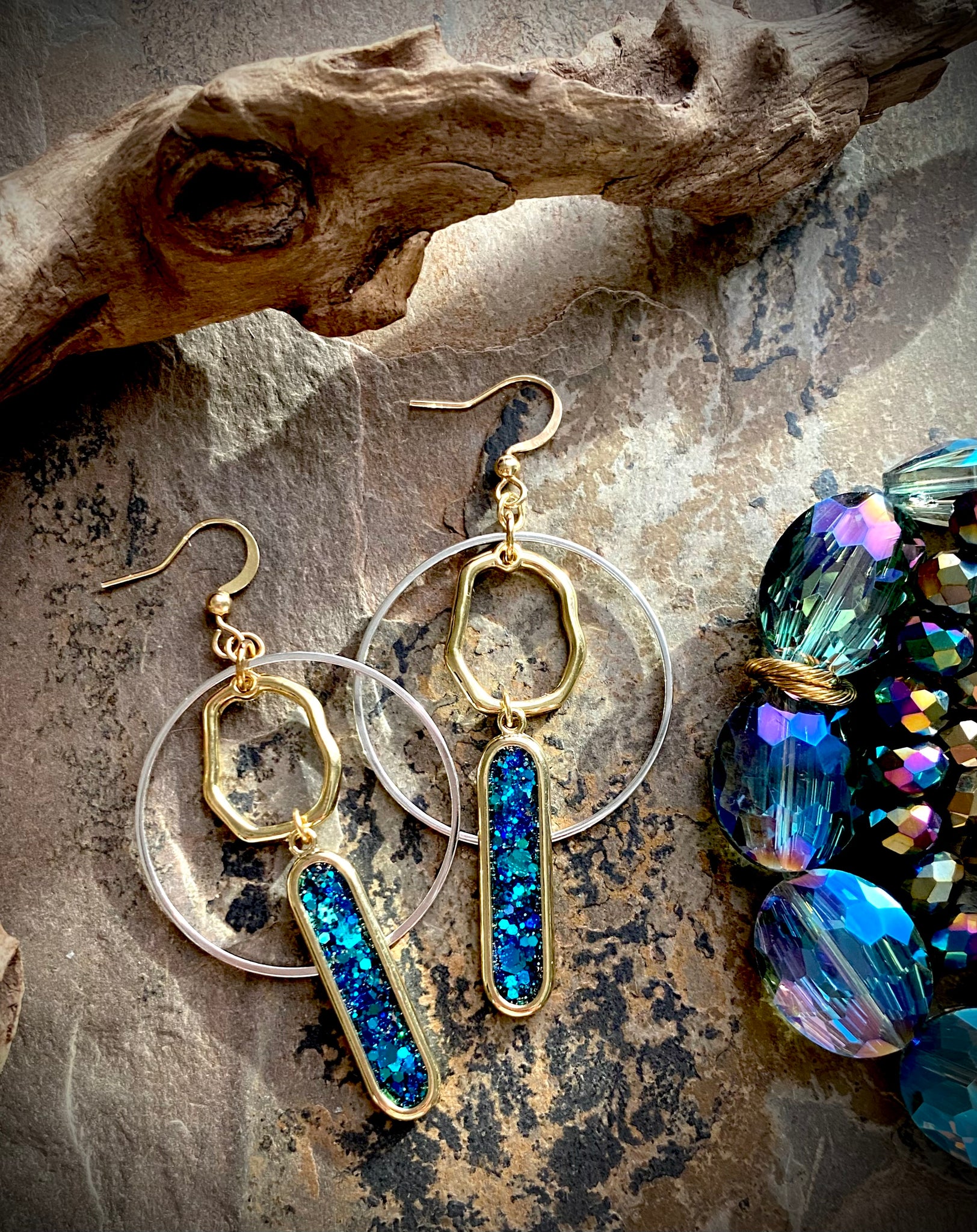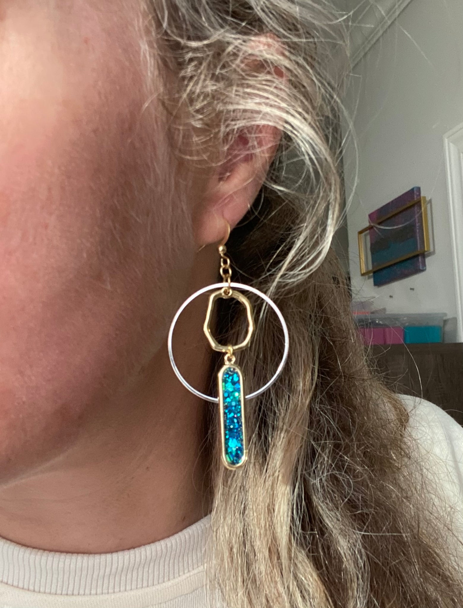 Mix of organic gold hoop, with outer silver hoop and blue glitter filled paperclip drop. Measures around 2.5 inches and very lightweight