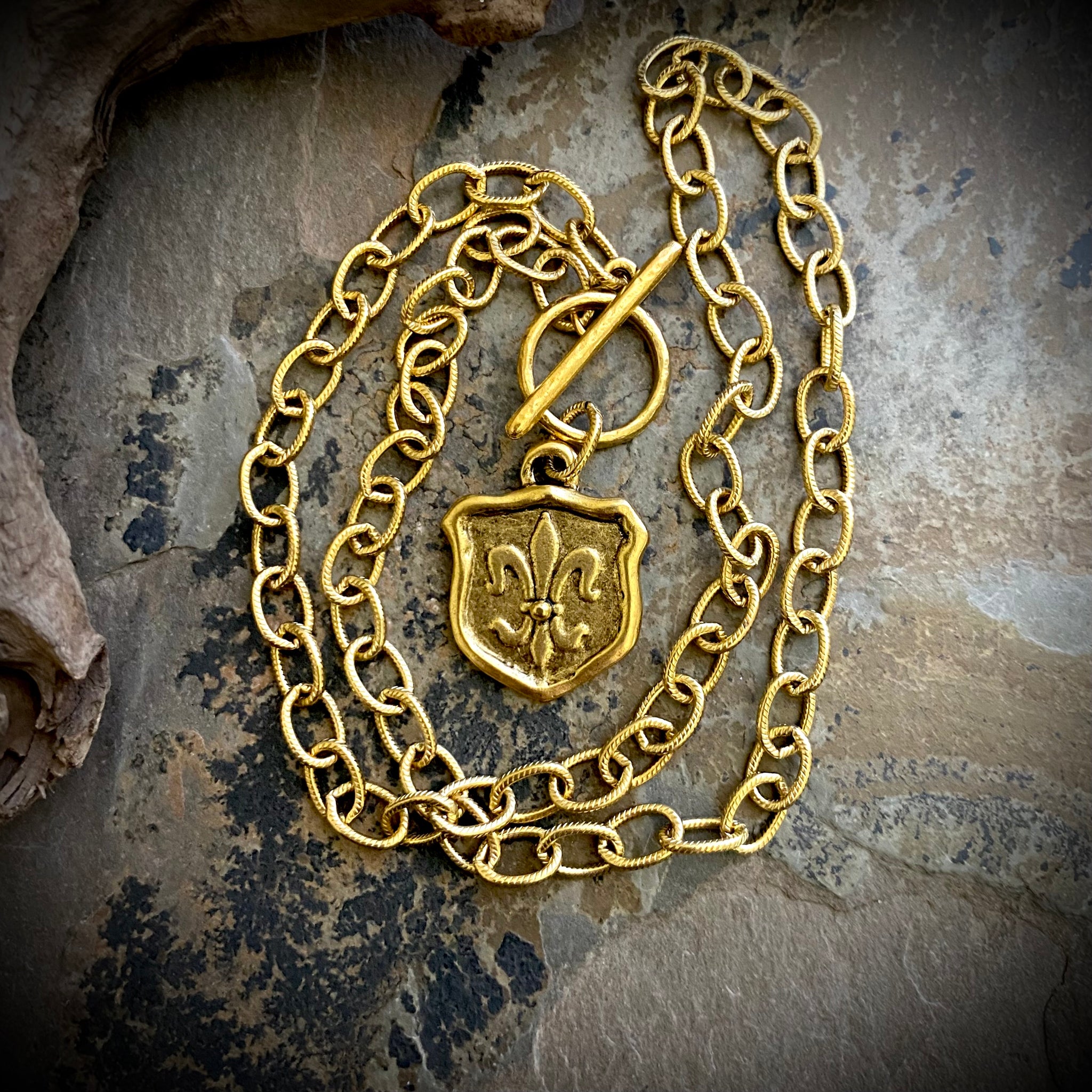 Created to compliment my favorite Mardi Gras bracelet, this gold plated Fleur de Lis tag, on gold plated toggle- grab your choice of chain- and your length as they are not adjustable.