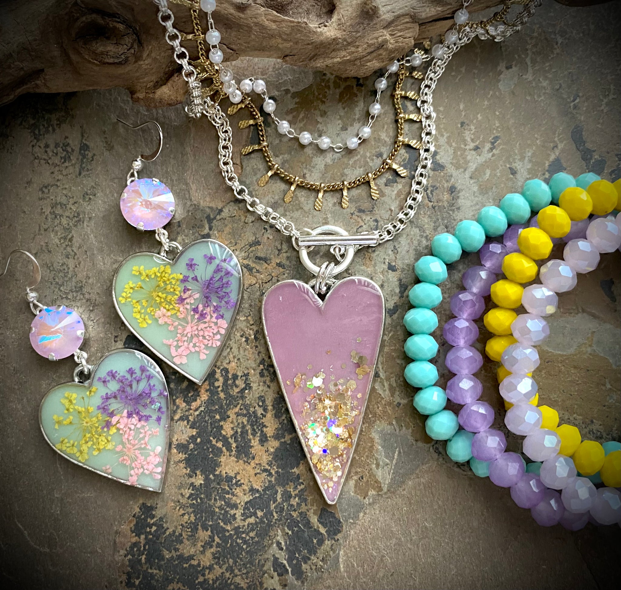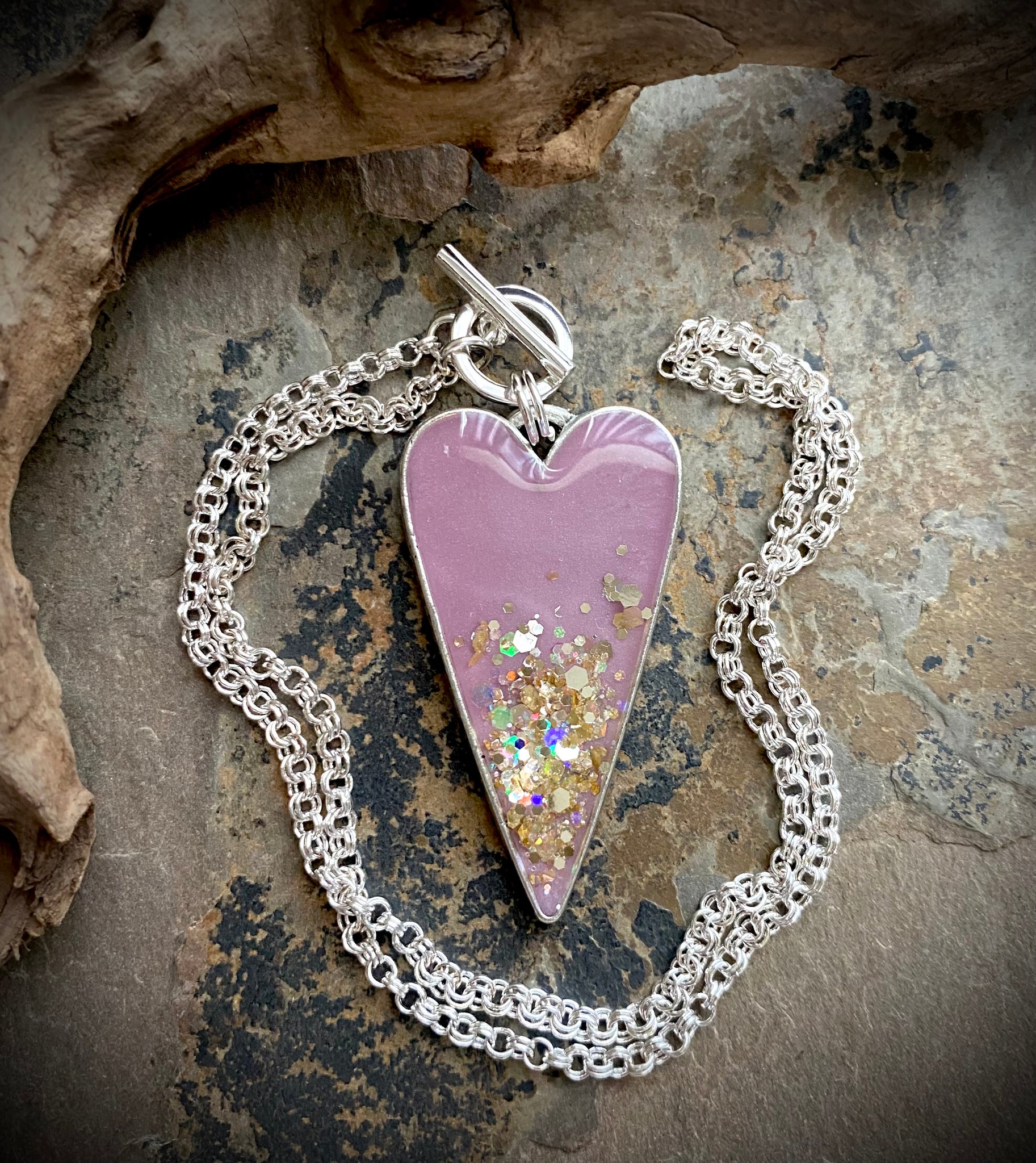 Handcrafted resin heart necklace- silver chain with toggle clasp- 18 inches
