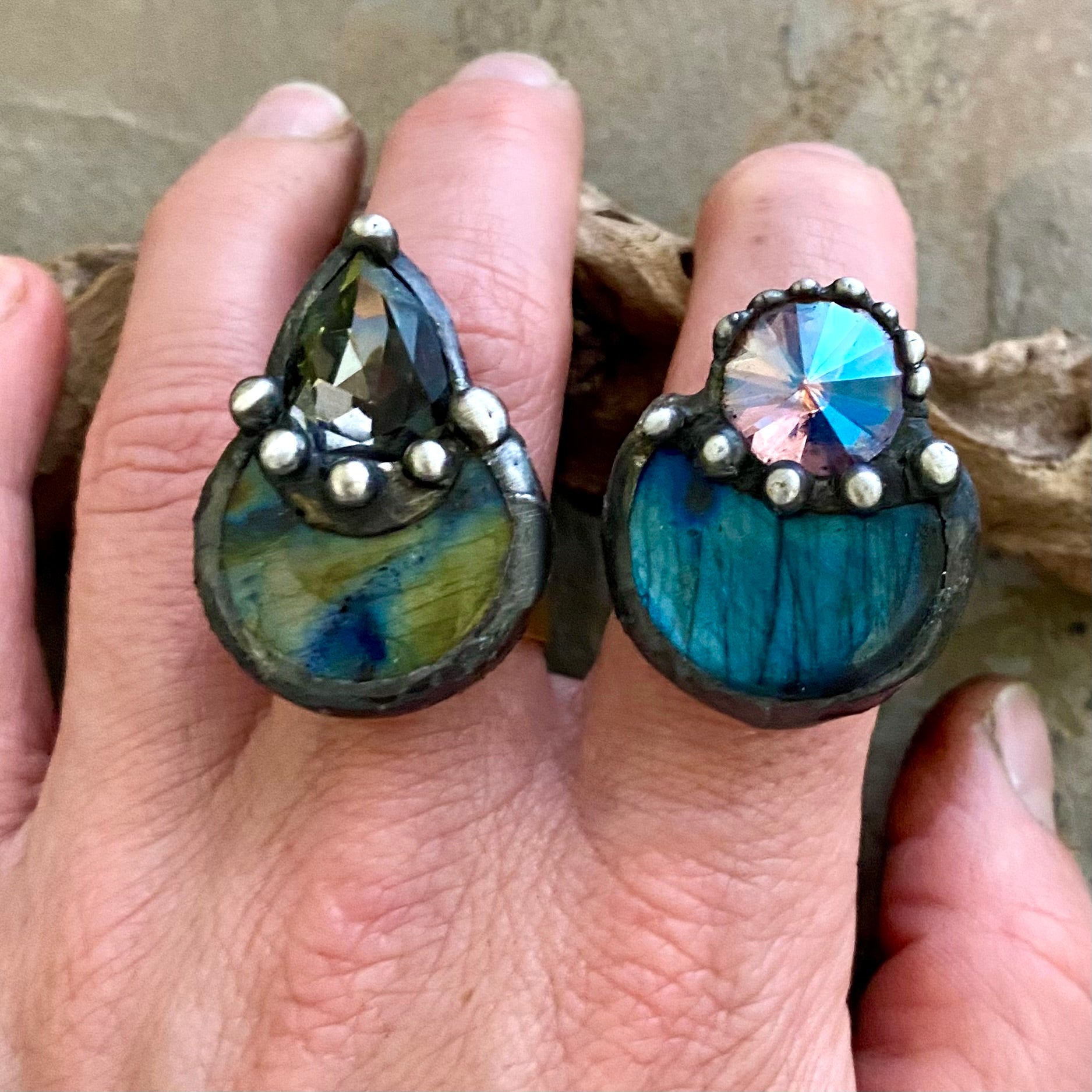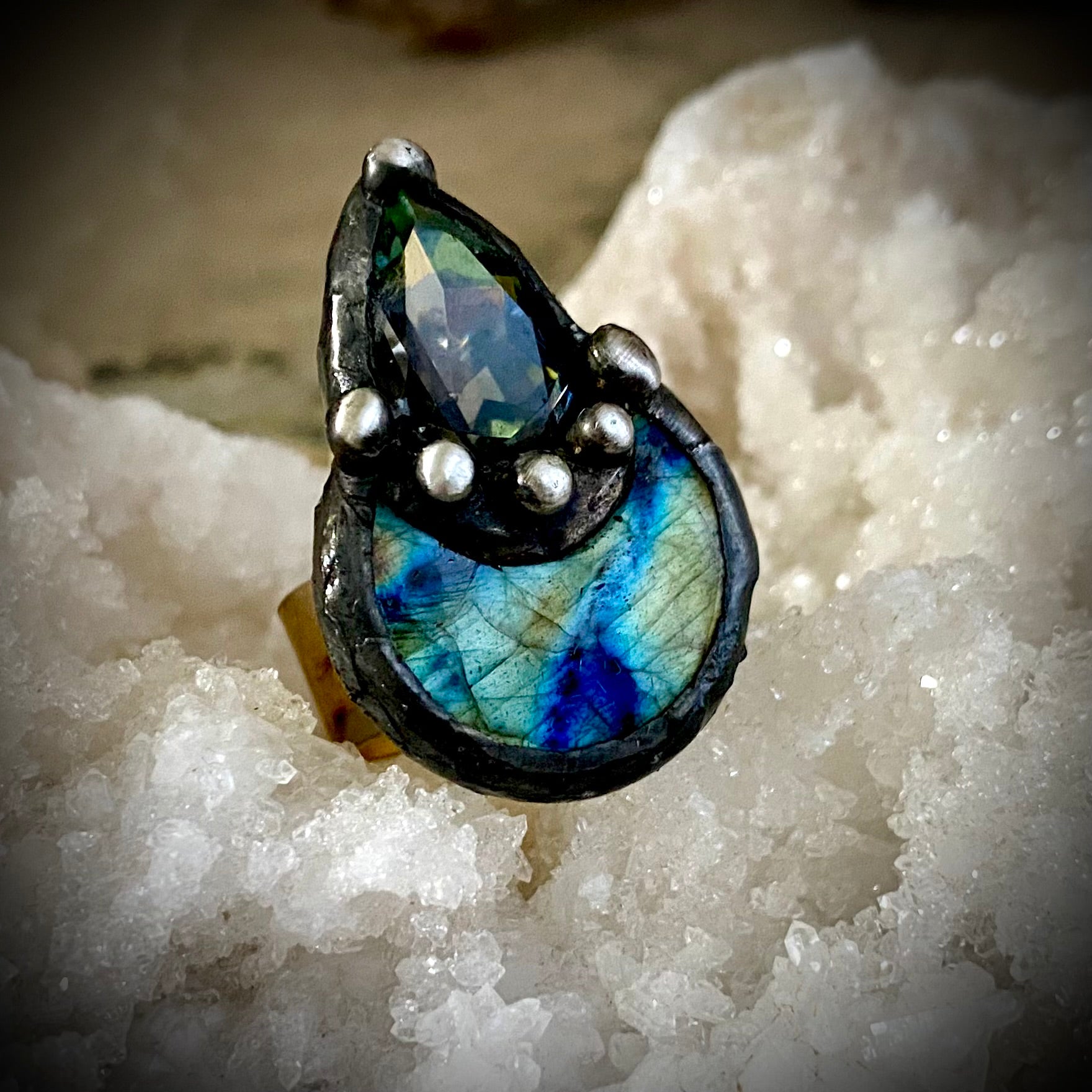 One of a kind, tabac Swarovski Crystal paired with stunning crescent labradorite stone- on adjustable gold, wide band ring base.