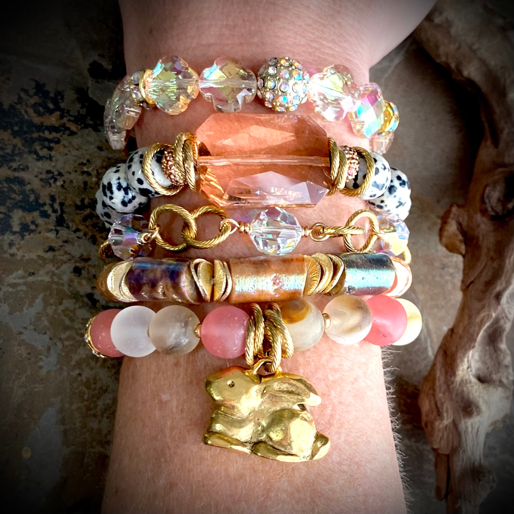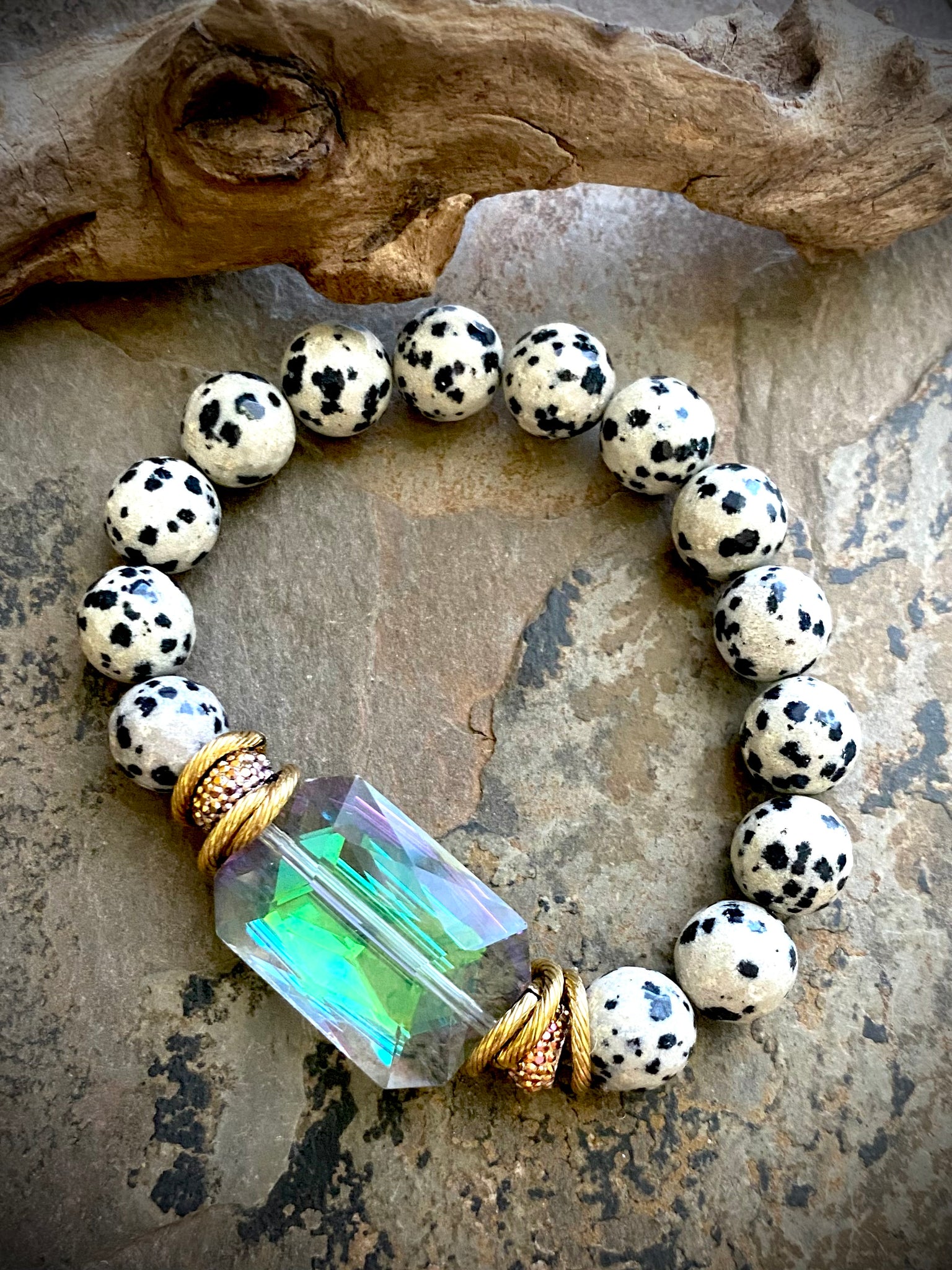 Dalmatian Jasper beads paired with gold links, small sparkly accents, and your choice of bright green, or pale pink rectangle crystal.