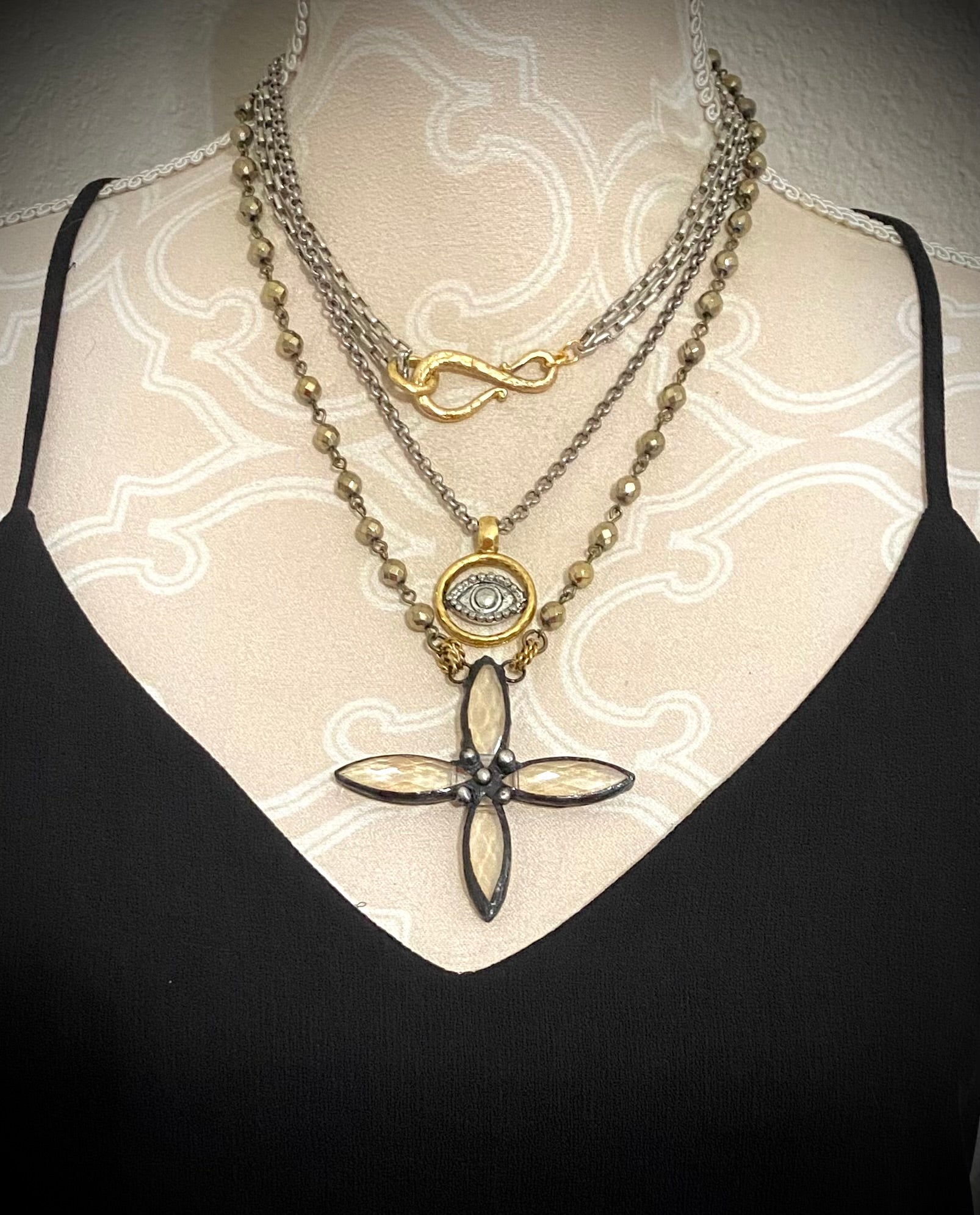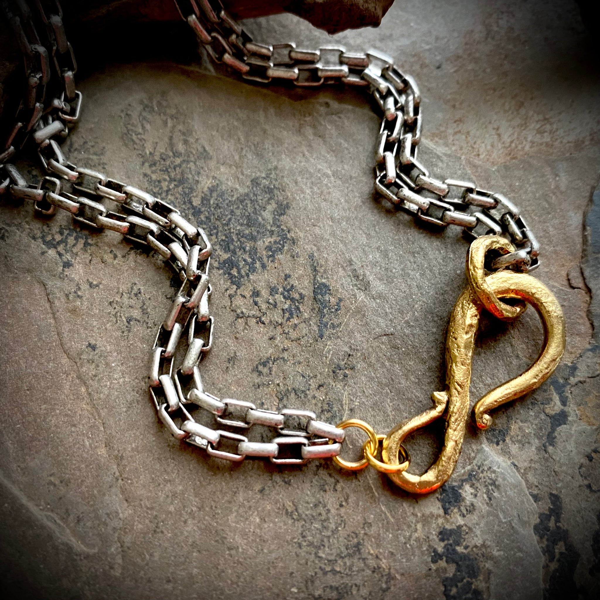 Large gold shepard’s hook with double antique silver chain. Please choose your length below as this is not adjustable.
